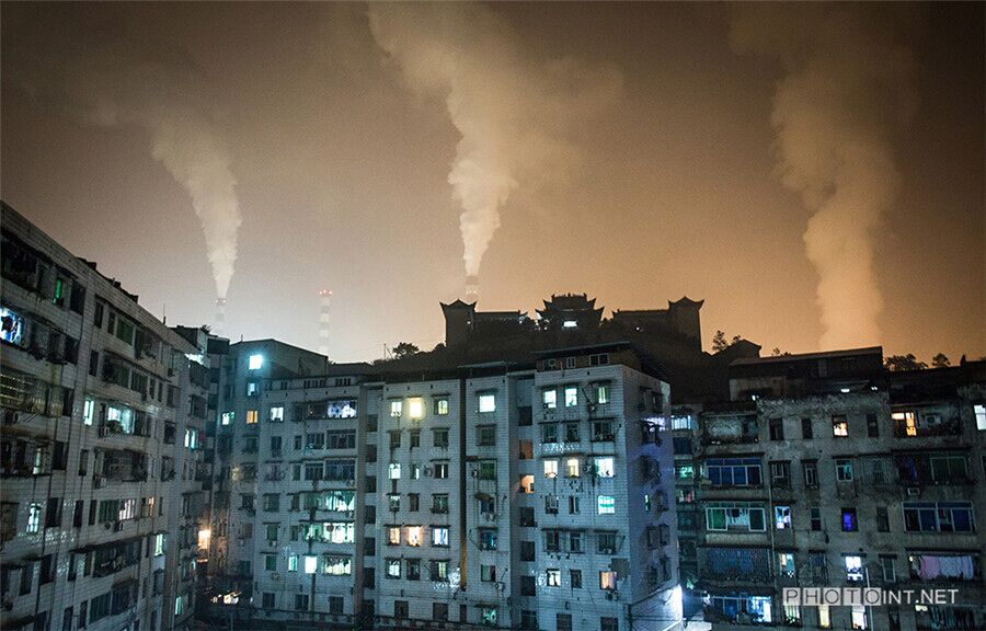 La nuit, les gens dorment chez eux, tandis que trois cheminées d'une centrale située à proximité crachent leur fumée, la municipalité de Chongqing, dans le Sud de la Chine. [Photo Liu Song / photoint.net]
