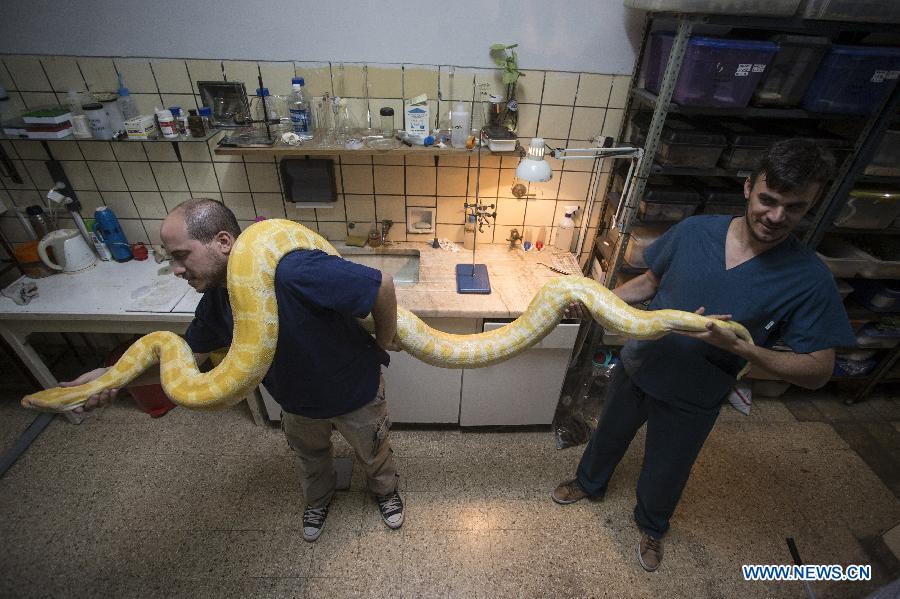 Photo prise le 21 avril 2015 dans la zone d'animaux toxiques du Département de la production d'antidotes de l'Institut Malbran à Buenos Aires, en Argentine. Ce département est en charge de produire des antidotes avec le poison extrait de serpents, d'araignées et de scorpions. (Xinhua/Martin Zabala)