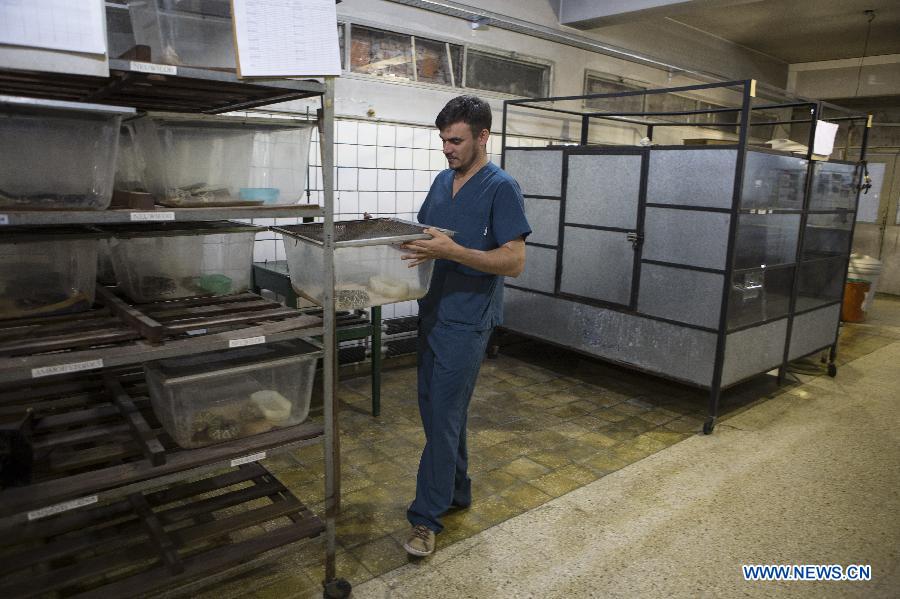 Photo prise le 21 avril 2015 dans la zone d'animaux toxiques du Département de la production d'antidotes de l'Institut Malbran à Buenos Aires, en Argentine. Ce département est en charge de produire des antidotes avec le poison extrait de serpents, d'araignées et de scorpions. (Xinhua/Martin Zabala)