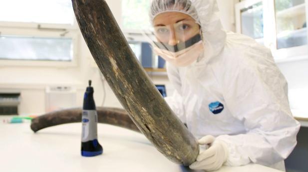 Une scientifique inspecte une défense de mammouth à la recherche d'un endroit pour prélever de l'ADN.