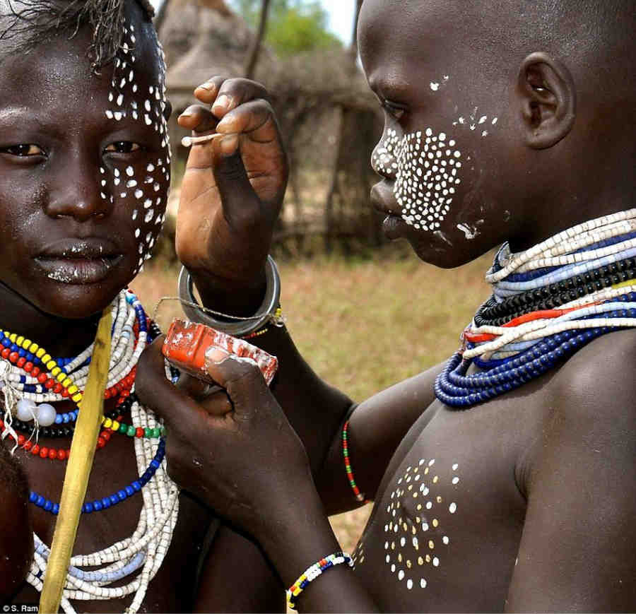1. Des habitants se peignent le visage dans un village en Ethiopie