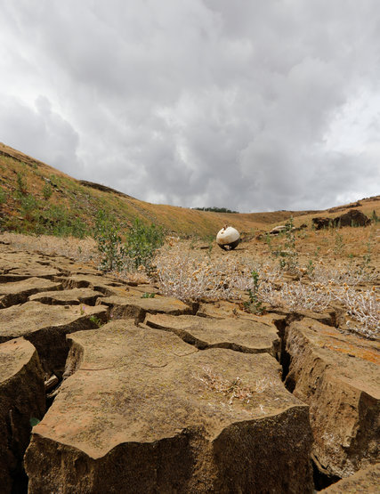 | Une bouée, abandonnée sur le fond craquelé du Lac McSwain désormais asséché. |
