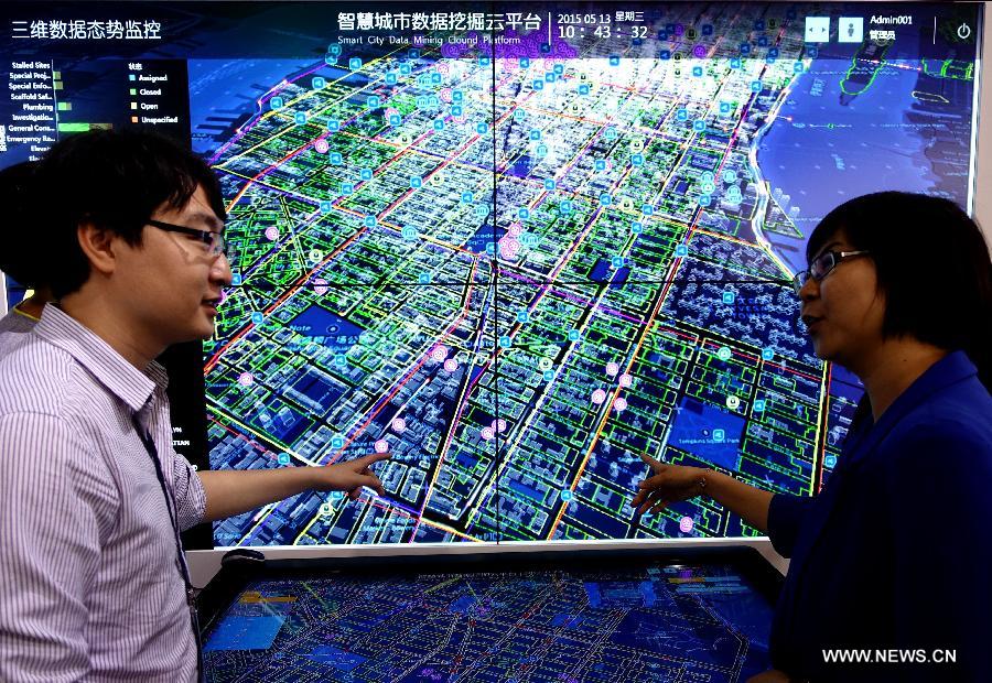 Un exposant introduit le projet ?Smart city data mining cloud platform?. [Photo/Xinhua]