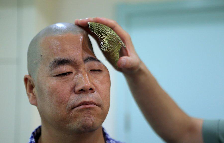 Une partie d'un crane de titane imprimé en 3D pour compléter le crane anormal d'un patient à Xi'an, la province du Shaanxi, le 27 ao?t 2014. [Photo/CFP]