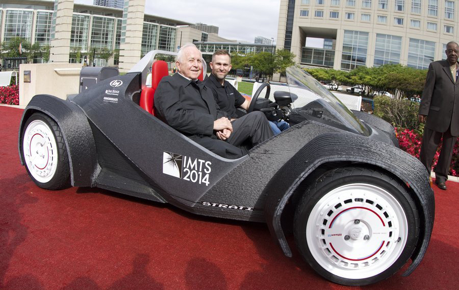 La Stratti, la première voiture imprimée en 3D, a été construite en seulement 45 heures à l'occasion de Exposition internationale de technologie manufacturière à Chicago (Etats-Unis) en 2014. La popularité des imprimantes 3D a augmenté chez les ingénieurs, concepteurs et fabricants, et en raison d'une baisse des prix, ces produits deviennent de plus en plus abordables. [Photo / CFP].