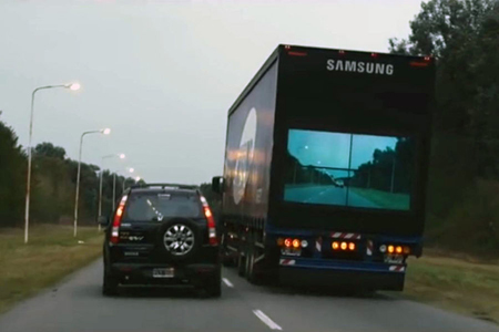 Pour parvenir à cet incroyable résultat, le géant coréen de la technologie n'a pas recouru à un quelconque tour de magie, ni même construit ses camions en verre. Non, il a tout simplement équipé certains de ses camions avec des caméras montées sur l'avant du véhicule et muni la paroi arrière d'un écran géant. Le conducteur voit donc, avant de se lancer dans une man?uvre potentiellement hasardeuse, la route qui se trouve devant le camion sur l'écran et peut donc savoir en permanence quand un dépassement en toute sécurité est possible.