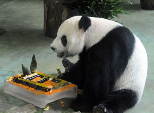 | Yuan Yuan, déguste son "gateau d'anniversaire" au zoo de Taipei. [Photo/Xinhua] |
