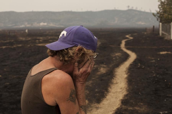 Robert Hooper, épuisés après plusieurs jours sans avoir pu trop dormir, est submergé par l'émotion en regardant sa propriété br?lée près de Middleton, en Californie, le 14 septembre 2015. [Photo/Agences]