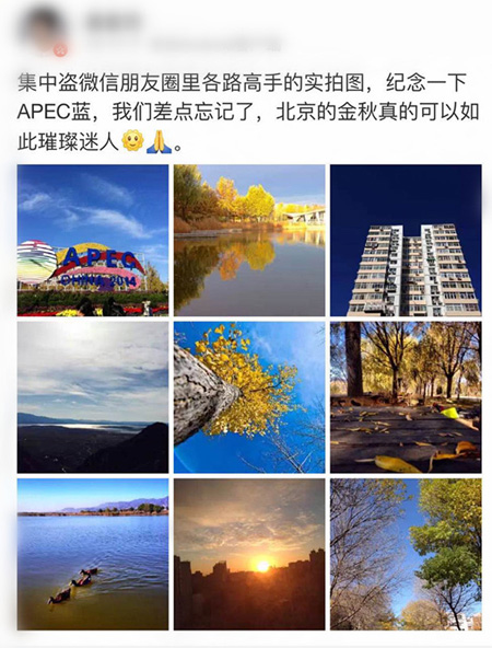 Un ensemble de photos de cieux ? bleu APEC ? de son cercle d'amis, rassemblées par un internaute enthousiaste sur son compte Weibo.