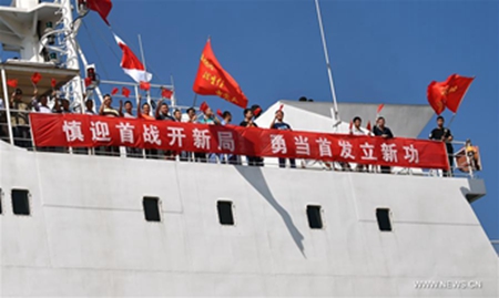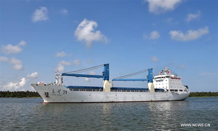 Le navire "Yuanwang 21" transportant la fusée porteuse Longue Marche-7 arrive dans la baie de Qinglan à Wenchang, dans la province chinoise de Hainan (sud), le 14 mai 2016. La fusée sera transportée prochainement au Centre de lancement des satellites de Wenchang par la route et ensuite testée pour son premier lancement en juin. (Photo : Guocheng)