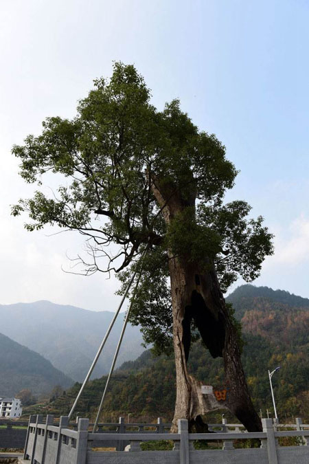 Un arbre de 300 ans à Wuyuan, dans la province du Jiangxi, est toujours florissant malgré le ce froid mois hivernal et après avoir été frappé par la foudre.