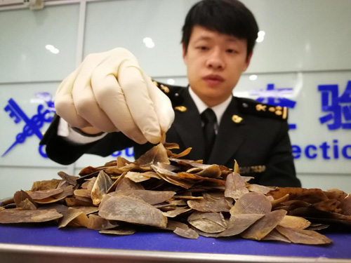 La douane de Yiwun dans l'est de la Chine a saisi le 21 février 2017 des écailles de pangolin et ivoires de contrebande. (Photo : People.cn)