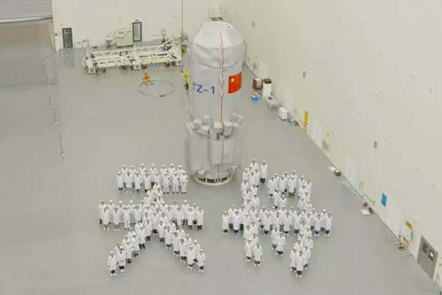 ? Tianzhou 1 ? et le personnel de recherche et développement, devant lequel il compose les caractères chinois ? Tianzhou ?. (Source : Académie des technologies spatiales de Chine)
