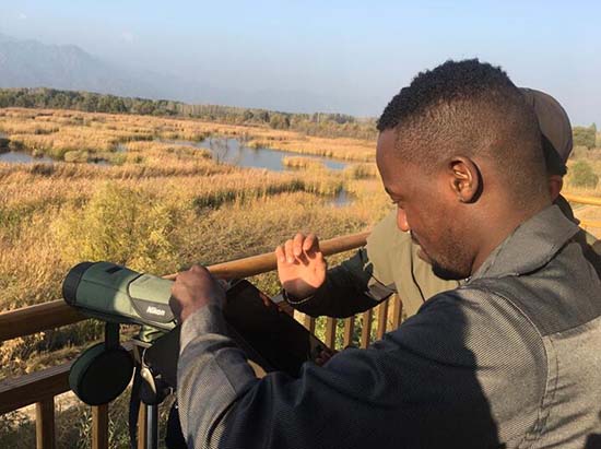 Les journalistes de médias étrangers observent la zone humide du lac aux canards sauvages à la jumelle. Wang Hailin, journaliste au Quotidien du Peuple.