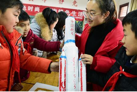 Des bénévoles expliquent des connaissances en sciences de l'aéronautique aux enfants des travailleurs migrants par le biais de maquettes d'engins spatiaux, le 28 décembre 2017. (Shi Yucheng / le Quotidien du Peuple en ligne)