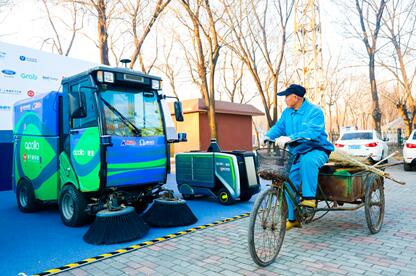 Un employé chargé du nettoyage des rues sur son tricycle passe devant un véhicule nettoyeur sans pilote, le 20 décembre 2017 dans le district de Xuan'an, dans la province du Hebei (nord de la Chine). Photo Yan Yuxiao / le Quotidien du Peuple en ligne
