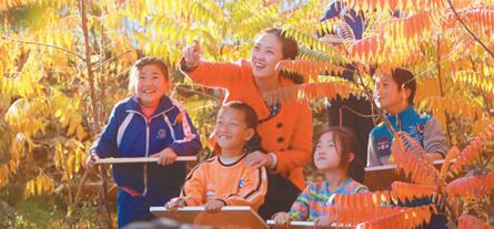 Une enseignante de l'école primaire expérimentale Shuangluan de Chengde, dans la province du Hebei, présente les beautés de la campagne à des élèves de l'école primaire Zhongyizi.