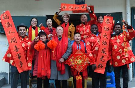 Dans la communauté de Jimingshan de la ville d'Yiwu, dans la province du Zhejiang, plusieurs étrangers venus notamment d'Iran, du Cameroun et de l'Ethiopie ont, avec la population locale, fait l'expérience du collage des sentences parallèles du Nouvel An, accroché des lanternes et participé à des d?ners de retrouvailles, découvrant ainsi la culture traditionnelle chinoise et pouvant ressentir une atmosphère chinoise toute particulière. Photo prise le 12 février 2018. (Gong Xianming / le Quotidien du Peuple en ligne)