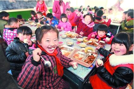 Dans une cantine de la province de l'Anhui, des enfants ? laissés derrière ? (un terme qui se réfère aux enfants de travailleurs migrants dont les parents sont partis travailler ailleurs) profitent d'un chaleureux ? déjeuner d'amour ?. (Photo / le Quotidien du Peuple en ligne).