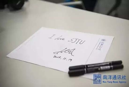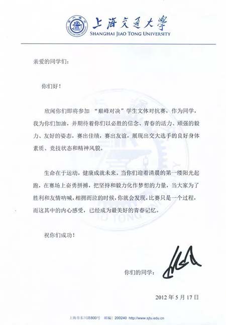 En 2013, en tant qu'étudiant, il avait déjà envoyé un message de voeux aux autres étudiants de l'Université Jiaotong de Shanghai : ? Puissent nos rêves s'envoler d'ici, l'Université Jiaotong de Shanghai est notre nom commun ?.