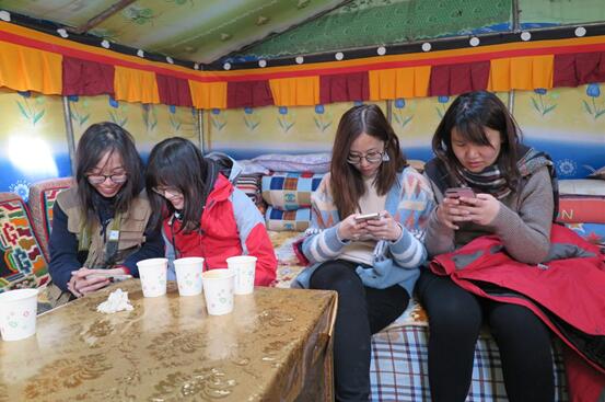 Des touristes utilisent leur téléphone portable pour accéder à l'Internet via le Wi-Fi dans un h?tel-tente situé dans le camp de base de tourisme du mont Everest. La plupart des h?tels-tentes du camp sont désormais couverts par le Wi-Fi et les visiteurs peuvent profiter d'une expérience en réseau commode à une altitude de 5 000 mètres. (Photo / Xinhua)
