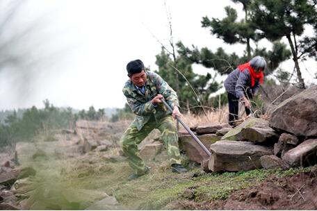 Liu Jichuan, 65 ans, est un ancien militaire qui habite le village de Xieweizi, dans le canton de Honghua du comté de Tancheng, à Linyi, dans la province du Shandong. En 2005, il a pris la responsabilité de 1 100 mu de collines dénudées pour les reboiser malgré l'opposition de sa famille. Les collines nues avec seulement quelques pierres rouges dans le passé sont maintenant devenues une destination touristique avec des arbres verts, des fleurs et des fruits tout au long des saisons. La photo montre Liu Jichuan (à gauche) sur le mont Maling, dans le comté de Tancheng, à ville de Linyi, dans la province du Shandong, au travail avec sa femme en pleine terre, le 10 mars 2019. (Photos / vip.people.com.cn)
