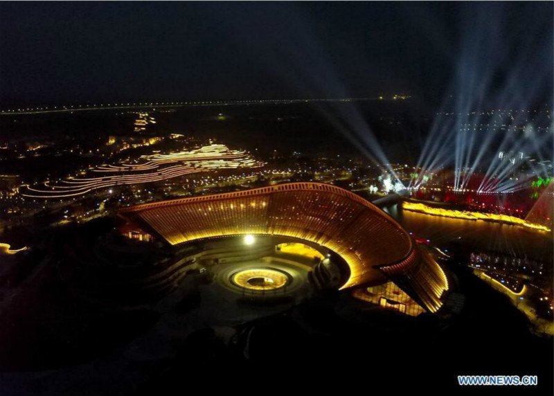 Photo aérienne prise le 26 mars montrant une vue nocturne du pavillon de la Chine sur le site de l'Exposition internationale d'horticulture de Beijing 2019, dans le district de Yanqing à Beijing. (Photo/Xinhua)