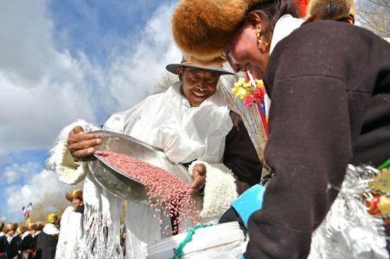 Des habitants locaux assistent à une cérémonie de labour de printemps dans la ville de Shannan, dans la région autonome du Tibet (sud-ouest de la Chine), le 16 mars 2019. (Xinhua / Li Xin)