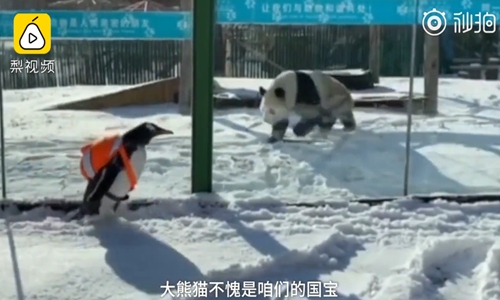 Voir le noir et blanc : un pingouin et un panda se rencontrent au zoo de Harbin Polarland à Harbin, capitale de la province du Heilongjiang (nord-est de la Chine). (Photo / Capture d'écran d'une vidéo de Pear Video)