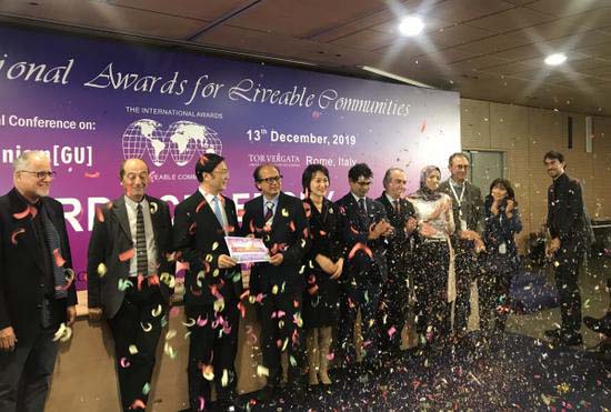 La délégation de Jinan applaudit la remise du Prix International 2019 pour les Communautés Habitables, après avoir remporté la plus haute distinction, le 13 décembre 2019 à Rome. (Photo fournie à chinadaily.com.cn)