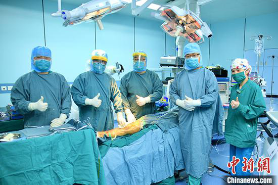 Les médecins prennent une photo après le succès de la première arthroplastie totale du genou (TKA) robotisée de Chine à Beijing. (Photo / China News Service)