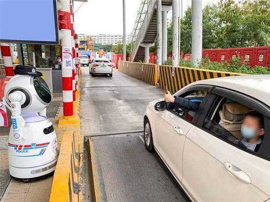 ? La police rappelle, si vous voulez entrer Shenzhen, scannez le code pour vous inscrire et passez rapidement, merci pour votre coopération ! ? Au point de contr?le de Hezhou à Shenzhen, ce robot 5G nommé ? Huang Tiantian ? agit comme un policier de point de contr?le à grande vitesse, rappelant aux conducteurs qui passent de scanner et de s'inscrire à l'avance 24 heures par jour, permettant d'économiser 4 policiers et réduisant le risque d'infection causée par un contact étroit. Dans le même temps, ? Huang Tiantian ? a fait de la publicité radio sur la situation épidémique pour réduire la pression policière.