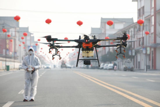 Le 9 février 2020, dans la ville de Lianyungang de la province du Jiangsu, des employés sont en train d'utiliser un drone pour désinfecter la ville. Si Wei/Photo du Quotidien du Peuple