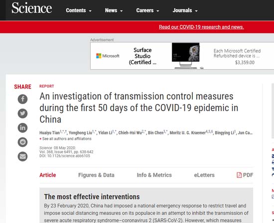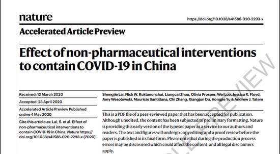 Le 4 mai, une étude publiée sur ? Nature ? a conclu que la Chine avait évité à des millions de personnes de contracter le virus à la fin de février avec trois mesures principales -les restrictions du trafic interurbain, le dépistage précoce et la surveillance des patients potentiels, et la pratique active de la distanciation sociale et des actions préventives personnelles. Sans la forte combinaison de ces mesures, estime le rapport, le nombre de cas de COVID-19 en Chine aurait pu être multiplié par 67 pour atteindre plus de sept millions.