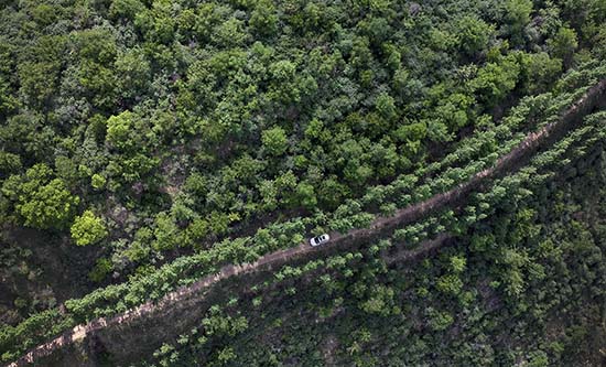 Des arbres couvrent une colline à Wuqi, dans la province du Shaanxi (nord-ouest de la Chine), le premier comté impliqué dans le programme de conversion des terres cultivées en forêts et prairies, en juin dernier. (Photo / Xinhua)