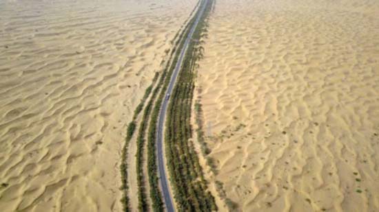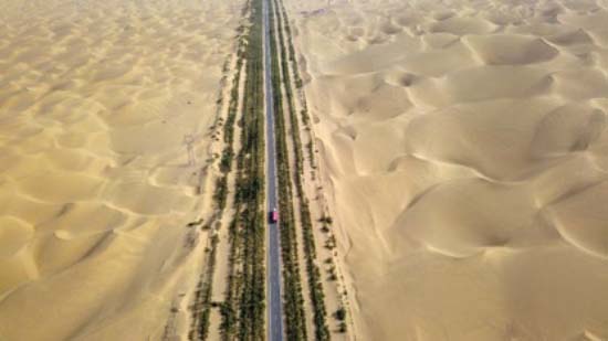 La construction des routes a amélioré la condition de vie et de déplacement de la population avoisinante. Les bandes forestières de protection ont été construites dans le désert pour protéger les routes. Grace à cette route, le désert ne sera plus un lieu sans vie.