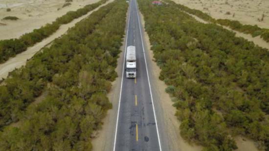 "Cela fait une vingtaine d'années que cette route au sein du désert a été mise en service. La qualité de la route est très bonne et la route est à peu près dans le même état aujourd'hui qu'il y a vingt ans. Les bandes de verdure aux deux c?tés sont très utiles car elles sont jolies et capables de consolider les sables", a dit le chauffeur Zhang. "Cette route revêt un sens particulier."