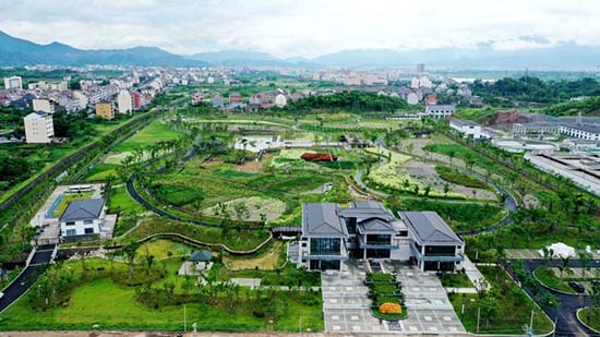 Une vue à vol d'oiseau du parc écologique des zones humides de la station d'épuration du comté de Xianju, dans la ville de Taizhou, province du Zhejiang, le 6 juin. (Photo par Wang Huabin / Quotidien du peuple)