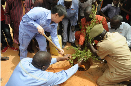 à Zinder au Niger, des employés nigériens et chinois de la société de raffinage, qui est la coentreprise entre PetroChina International et le gouvernement nigérien, plantent des arbres ensemble. (Photo par la filiale de PetroChina International en Afrique de l'Ouest)
