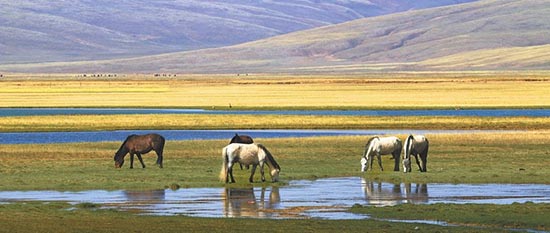 "Les animaux que nous n'avons jamais vus sont apparus. Les animaux que nous voyions rarement apparaissent en troupeau." à partir de la source du fleuve Jaune, on voit de belles prairies et d'immenses lacs. On voit partout des oiseaux sauvages comme des oies à tête barrée et des Tadorne casarca. Nous sommes bien au premier parc national pilote en Chine : le parc national pilote des sources des trois rivières.