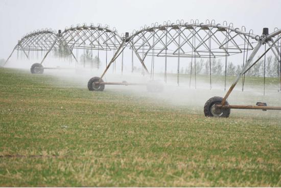 Le 3 mai 2020, la prairie artificielle est arrosée par aspersion à Shaogen Soum de la bannière d'Ar Horqin de la ville de Chifeng de la région autonome de Mongolie intérieure. La bannière de Horqin a fait pousser les herbes compte tenu de la désertification grave et de l'abondance de ressources en eau souterraine. Le taux de couverture végétale a dépassé 90%. (Li Fu/ Pic.people.com.cn)