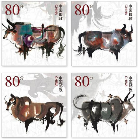 Publiée lors de l'équinoxe de printemps, la collection comprend cinq timbres représentant cinq boeufs labourant les champs dans une oeuvre d'art réaliste de Han Huang, homme politique et artiste reconnu de la dynastie Tang.