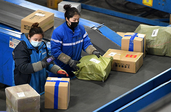 Des travailleurs trient des colis dans une entreprise de la livraison à Zhengzhou, dans la province du Henan, dans le centre de la Chine, le 21 janvier 2021. (Photo/Xinhua)