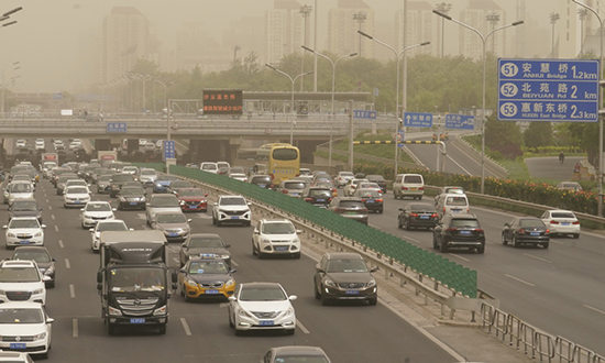 Des voitures roulent sur la route sous les tempêtes de sable à Beijing, le 6 mai 2021. (Feng Yongbin / chinadaily.com.cn)
