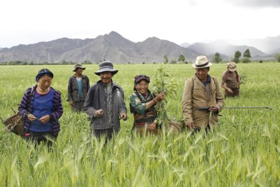 Les travailleurs scientifiques et technologiques enseignent aux agriculteurs locaux à cultiver l'orge des hauts plateaux dans la région autonome du Tibet (sud de la Chine) (DAQIONG/CHINA DAILY)