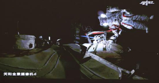 Les ta?konautes chinois, Liu Boming et Tang Hongbo, sont vus en train d'effectuer des activités extravéhiculaires (EVA) à partir du module central de la station spatiale Tianhe dimanche matin. (Photo / Xinhua)