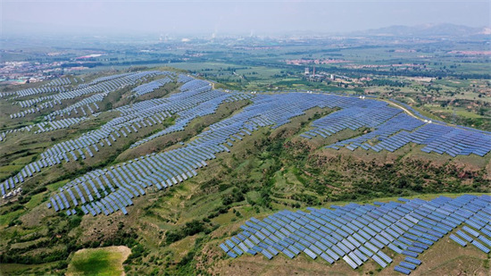 Le 10 ao?t 2021, la photo montre une centrale photovolta?que sur une montagne dans le village de Zhangjiazhuang de la ville de Zhangjiakou de la province du Hebei (dans le nord de la Chine). (Chen Xiaodong / Pic.people.com.cn)