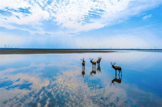 Le 8 septembre 2021, des cerfs du père David sauvages s'amusent sous le ciel bleu dans la zone humide de Tiaozini de la ville de Dongtai de la province du Jiangsu (dans l'est de la Chine). (Sun Jialu / Pic.people.com.cn)