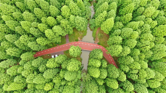 Le 13 mai 2021, la photo prise par un drone montre le parc national forestier de la mer Jaune dans la province du Jiangsu (dans l'est de la Chine) en été. (Xu Congjun / Pic.people.com.cn)