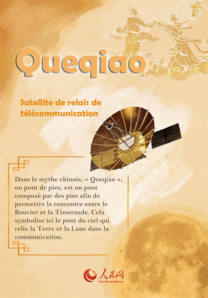 Queqiao est un satellite servant de relais de communications pour la sonde lunaire Chang'e-4 qui s'est posé sur la face cachée de la Lune et ne peut donc pas communiquer directement avec la Terre. Le 14 juin 2018, Queqiao est entrée avec succès sur l'orbite de la mission Halo autour du point Lagrange L2 du système Terre-Lune à environ 65 000 kilomètres de la Lune. Dans la mythologie chinoise, il est dit que le Bouvier et la Tisserande furent séparés par la voie lactée et qu'ils ne furent autorisés à se rencontrer que le septième jour du calendrier lunaire de chaque année. Ainsi, ce jour-là, des pies du monde entier survolent ici et s'accrochent avec leur corps afin de former un pont, le ? Queqiao ?, dans le but de favoriser la rencontre entre le Bouvier et la Tisserande. Le satellite de relais Queqiao est aussi comme un pont spatial, reliant ainsi la Terre et la Lune.